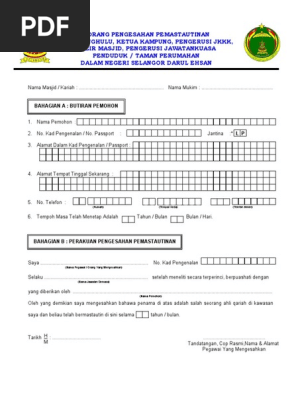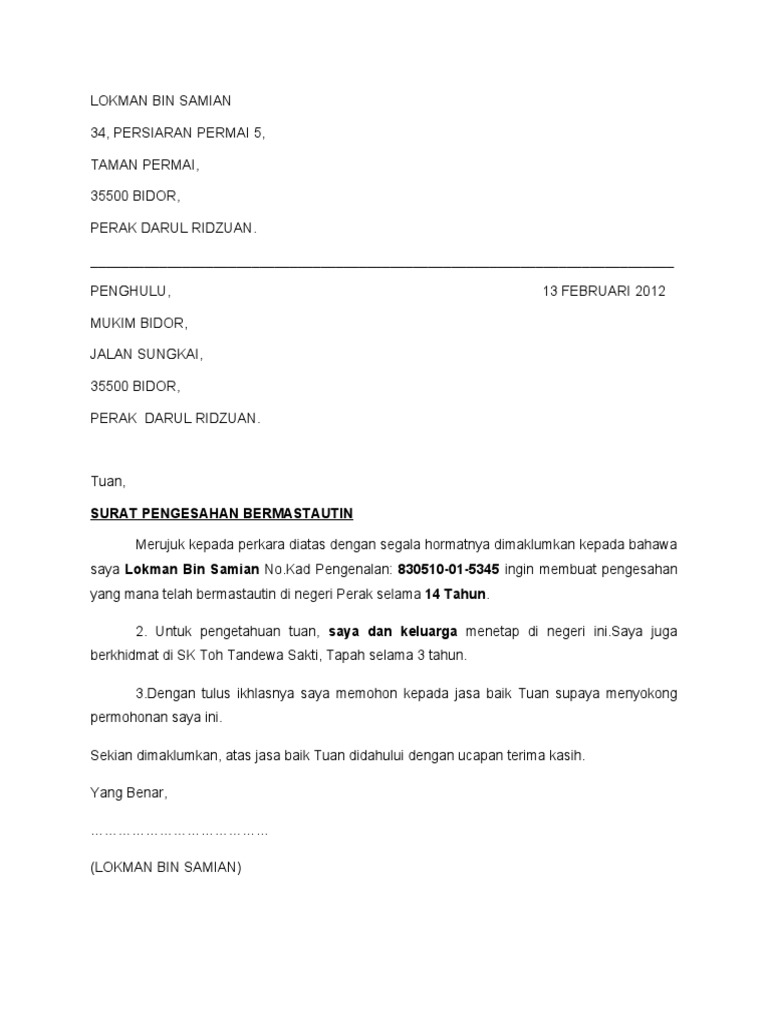 Surat Pengesahan Bermastautin from imgv2-2-f.scribdassets.com Sudah pernah lihat contoh surat rekomendasi kuliah? Bagi yang kesulitan dalam membuatnya, maka contoh surat rekomendasi merupakan solusinya. Oleh karena itu, surat masih … continue reading 'contoh surat bahasa. 5) surat pengesahan mastautin pemohon daripada penghulu/ketua kampung/nazir masjid/pengerusi jkkk/pengerusi jawatankuasa penduduk taman perumahan. Bagi anda yang sedang berniat membuat dokumen lamaran kerja di sebuah institusi dan perusahaan tertentu, contoh surat lamaran kerja berikut ini bisa menjadi referensi yang bermanfaat. Surat undangan adalah sebuah surat yang dikeluarkan baik oleh pribadi maupun lembaga atau perusahaan yang ditujukan kepada pihak yang bersangkutan dengan isi untuk mengundang mereka agar hadir pada acara yang dibuat. Contoh surat bisnis, surat dinas, surat izin, surat kuasa, surat lamaran kerja, surat pemberitahuan, surat penawaran, surat pengunduran diri, surat peringatan, surat perjanjian, surat pernyataan, surat resmi, surat undangan. Sebagai contoh kalau awak bernikah di selangor, awak perlu isi borang bermastautin selangor.